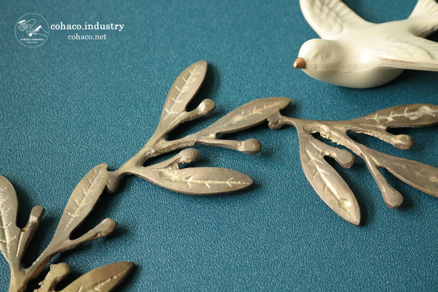 ゴールドの鳥さんはレジンですが、オリーブのリースは真鍮。