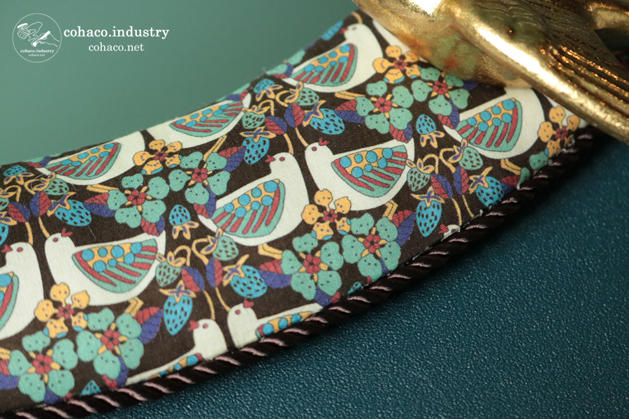 「夏の饗宴のために、青い鳥が運んできたイチゴ」というテーマのこの生地が可愛くて、いつか特別な物を作ろうとずっと温めていました。